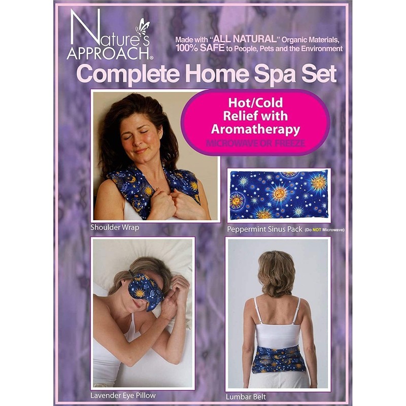 - AT HOME SERENITY: The full 4-piece set includes a wrap for the chest, neck, and shoulders, a belted lumbar wrap for the hips, abdomen, and lower back, an eye mask to relieve headaches and aching eyes, and a sinus pack that smells like sweet peppermint (REMINDER: Sinus Pack NOT microwave safe)