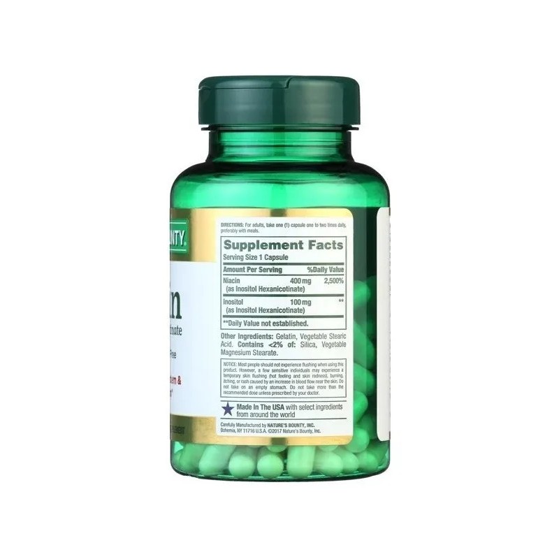 Nature's Bounty Niacin 500mg (120 cápsulas) es un suplemento sin sabor, sin enrojecimiento, vegano y sin gluten, con Niacina e Inositol en forma de hexanicotinato de inositol. Ayuda a la conversión de alimentos en energía celular y apoya la salud general, evitando el "flush".