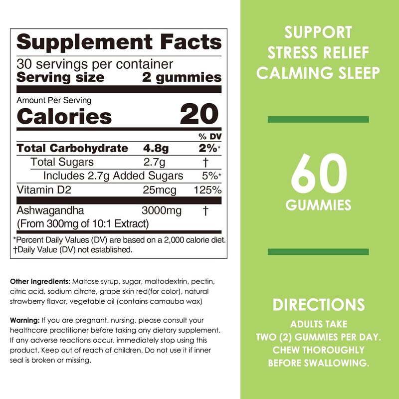 - 3000mg Ashwagandha per serving, with vitamin D2 for added absorption, all you need is 2 ashwagandha gummies per day for complete mood support. All ingredients are safe, natural, independent, and 100% drug-free.
