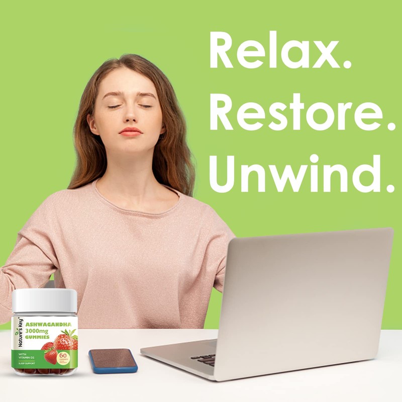 Nature's Key Ashwagandha Gummies, 3000mg High Potency Ashwagandha Root Extract with Vitamin D2, Stress, Calm Mood & Cognition, for Men & Women, Strawberry Flavor (60 Count (Pack of 1)