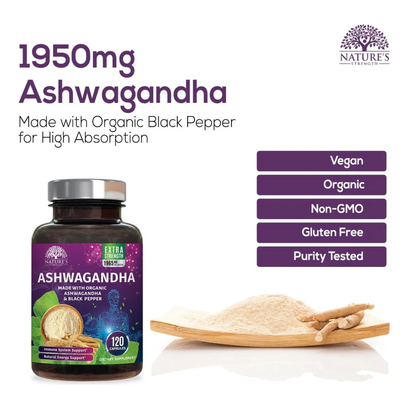 🧘 Nature’s Strength Ashwagandha Orgánica Extra‑Fuerte 1950 mg – 120 Cápsulas Veganas 🌿