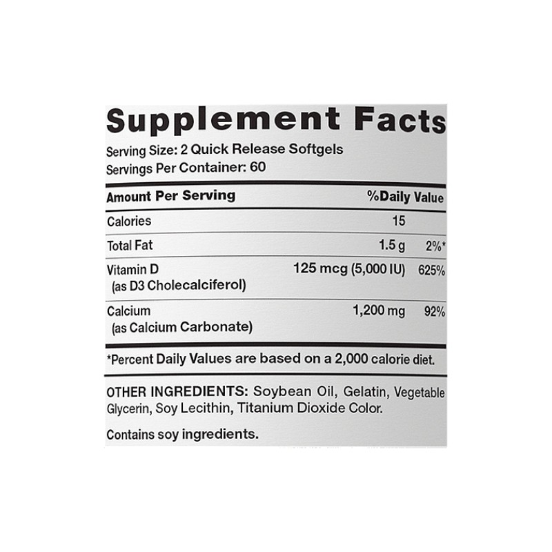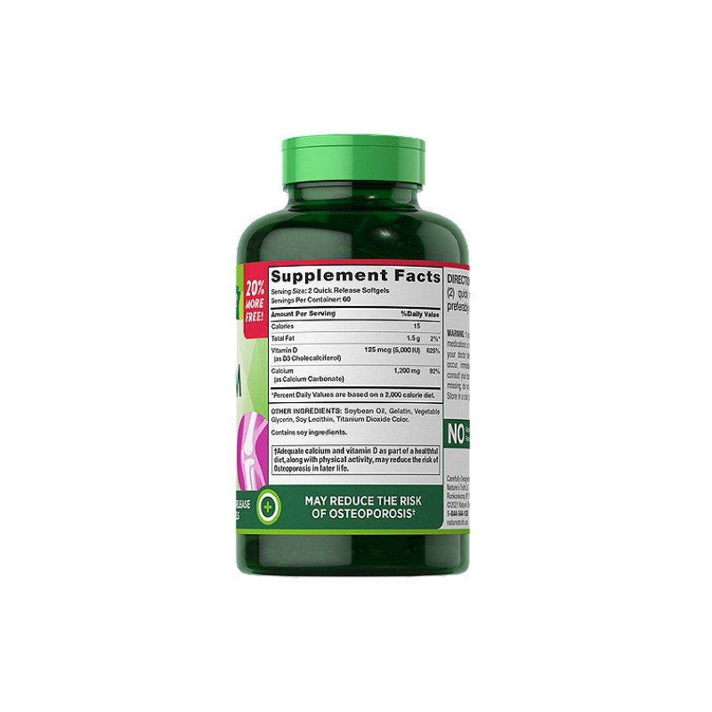 Nature's Truth Vitamins Absorbable Calcium Dietary Supplement, 1200 mg, 120 countSupport your bones with Calcium!? Commonly found in dairy, Calcium is an essential mineral that is known for supporting bone health and, when combined with Vitamin D, may reduce the risk of Osteoporosis.†** Our highly absorbable formula combines Calcium with Vitamin D3 for added support. Each serving of our quick release softgels provides you with 1,200 mg of Calcium and 125 mcg (5,000 IU) of sunny Vitamin D3, making it easier than ever to add these essentials to your daily wellness routine.**Adequate calcium and vitamin D as part of a healthful diet, along with physical activity, may reduce the risk of Osteoporosis in later life.†These statements have not been evaluated by the Food and Drug Administration. This product is not intended to diagnose, treat, cure or prevent any disease.
