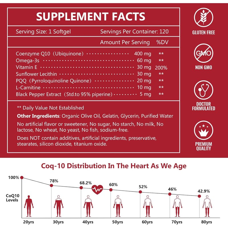 • NOTHING TO LOSE! Each bottle undergoes rigorous third-party testing for purity and potency before it arrives. Includes a 120-count bottle of CoQ10 softgels for a 120-day supply. No artificial flavors, preservatives, or colors added