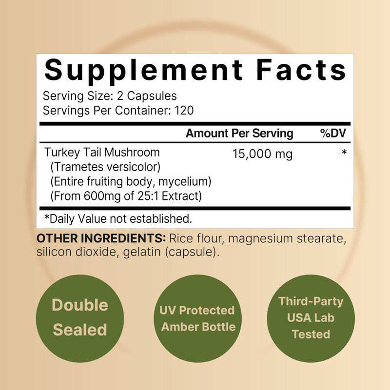 - Authentic non-GMO Turkey Tail supplements. Contains pure ingredients free of soy, dairy, eggs, gluten, wheat, preservatives, fish, peanuts, and tree nuts. All products are also 3rd party lab tested for safety and potency.