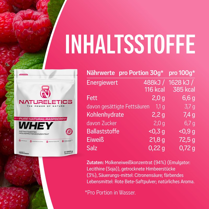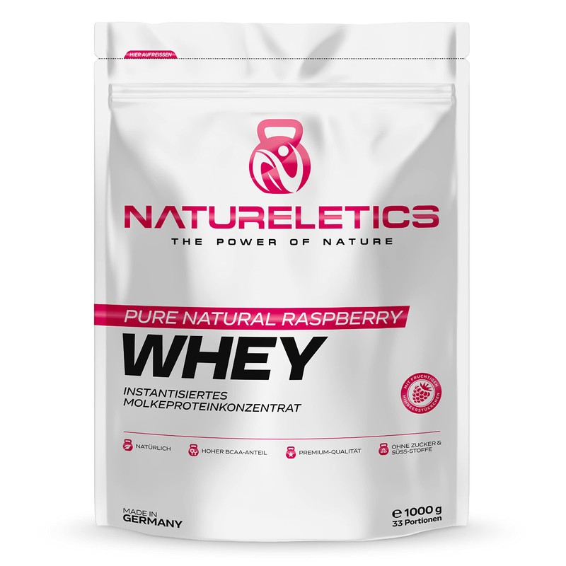 NATURELETICS RASPBERRY 1 kg Natural Premium Whey Protein from Germany without Added Sugar Sweeteners, Protein Powder with a High BCAA Content of 22.6%