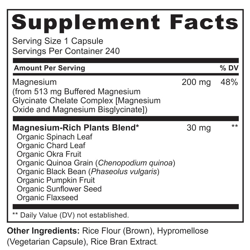 - PLANT-BASED SUPPLEMENT: 200 mg Magnesium plus organic vegetables and seeds with naturally-occurring magnesium, including organic spinach, swiss chard, okra, quinoa, black bean, pumpkin seed, sunflower seed and flaxseed.