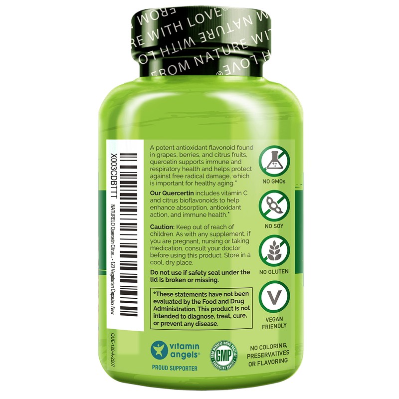 - FROM NATURE WITH LOVE: Our plant-based formula features quercetin, a plant pigment found in elderberry and red wine grapes, along with vitamin C from acerola cherry and bioflavonoids from citrus fruits. Non-GMO and vegan with no preservatives, coloring or flavoring.