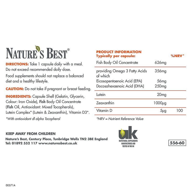 Do not exceed recommended daily dose. - Formula: Typically per capsule:Fish Body Oil Concentrate626mgproviding Omega 3 Fatty Acids356mgof whichEicosapentaenoic Acid (EPA)56mgDocosahexaenoic Acid (DHA)250mgLutein20mgZeaxanthin1000µgVitamin D5µg