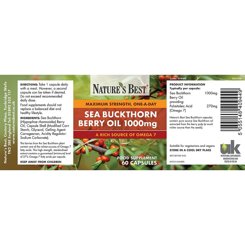 Food supplements should not replace a balanced diet and healthy lifestyle. - Formula: Typically per capsuleSea Buckthorn Berry Oil1000mgprovidingPalmitoleic Acid (Omega 7)270mg