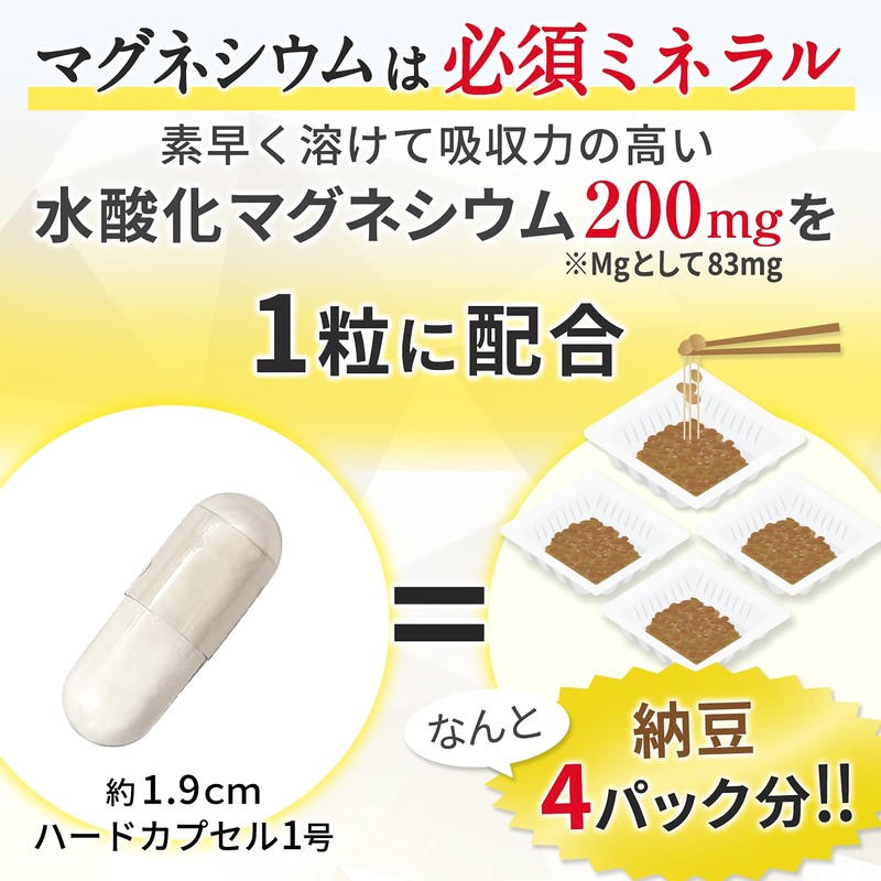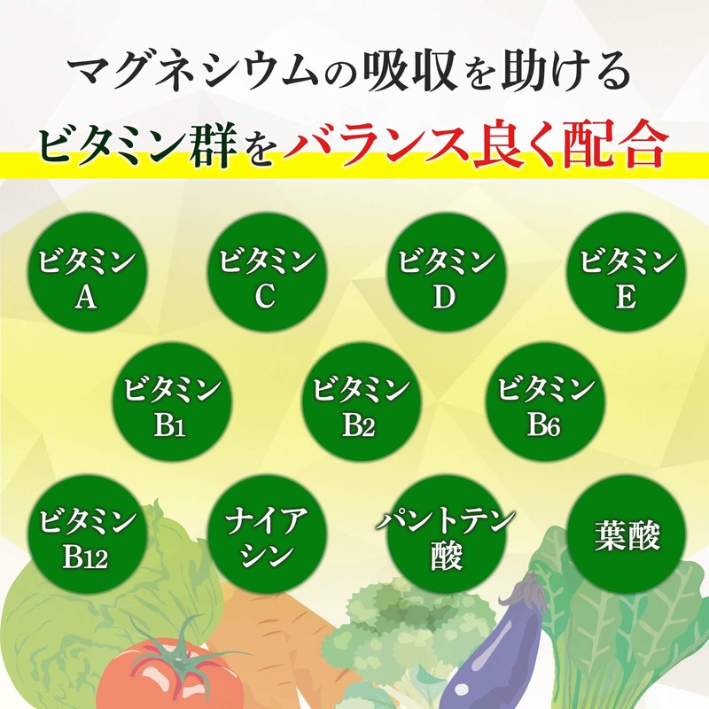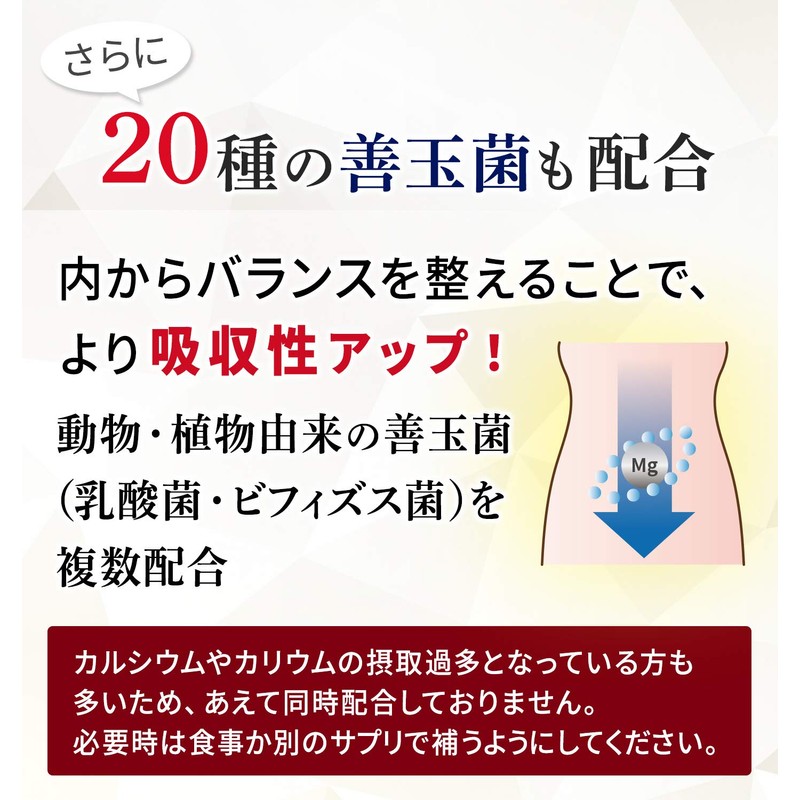 - 【商品概要】1日不足分をしっかり補えるよう、水酸化マグネシウムを1粒200mg配合。(Mgとして83mg) マグネシウムと相性の良いビタミン群(A、D、E、C、B1、B2、B6、B12、ナイアシン、パントテン酸、葉酸)をバランスよく配合し、さらに20種の善玉菌(動物・植物由来の乳酸菌&ビフィズス菌)を同時配合。