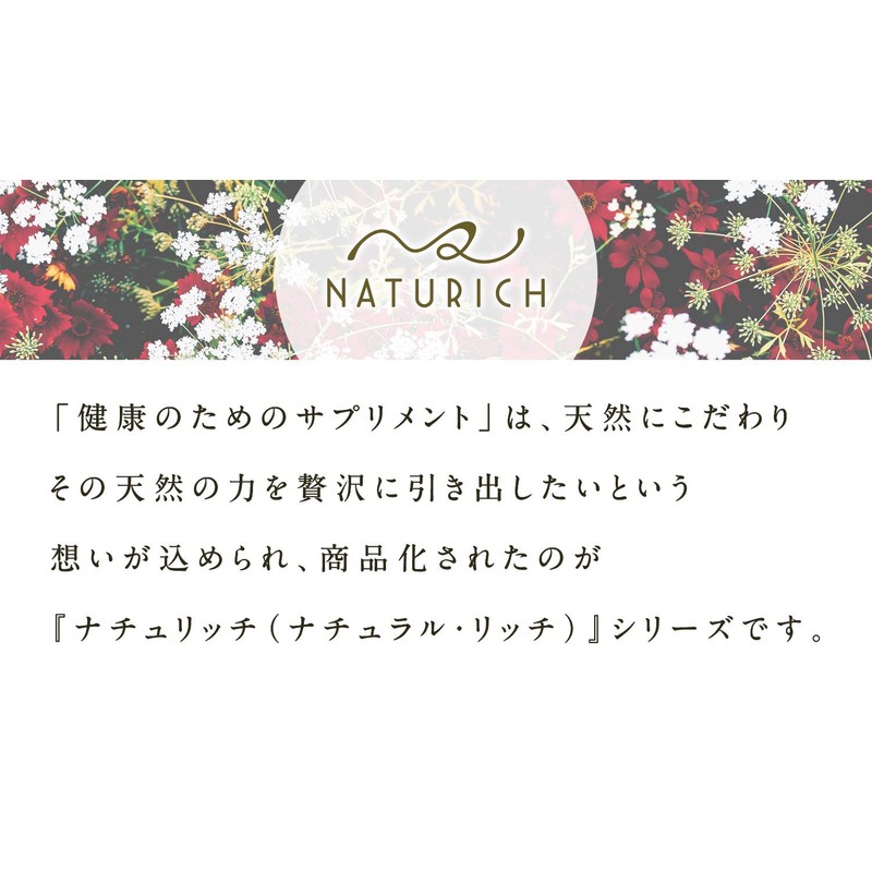 - * 【ナチュリッチ】サプリだからこそ天然の力を徹底的に引き出す。産地・栽培方法・非遺伝子組換えなどにおいて、安全性が高く、有効成分の濃度が高い素材を国内外から厳選。ナチュラルリッチなサプリメントをお届けします。