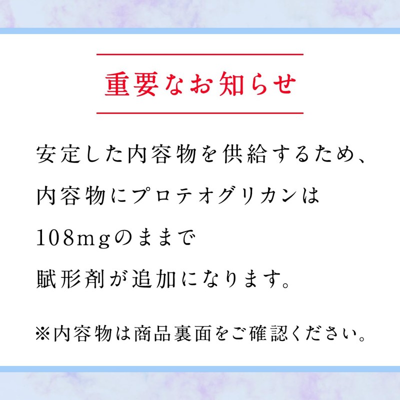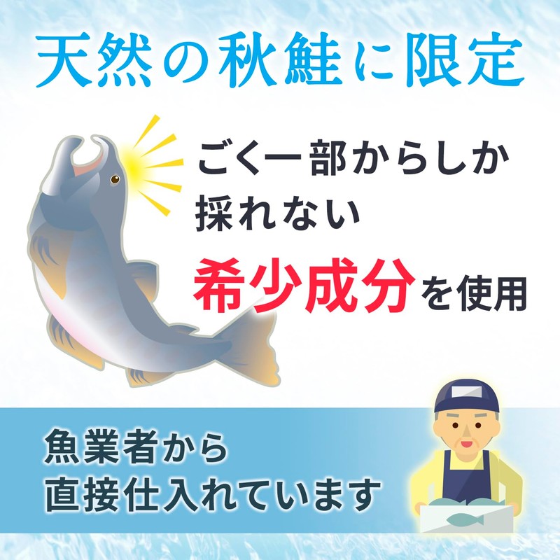 - 【商品概要】美と健康を保ちたい方にとって頼もしいプロテオグリカン。高額原料ですが、『ぎゅっと秋鮭プロテオグリカン』はプロテオグリカンエキス末だけを100%凝縮。一切成分を薄めず、1日15㎎(15,000μg)のプロテオグリカン含有(=プロテオグリカンエキス末換算108㎎)を配合!原料は、国内産の沖獲れ秋鮭に限定し、鮮度が良いうちにフリーズドライ加工。漁業者と直結仕入れだからできる高品質&安さの両立を叶えました。