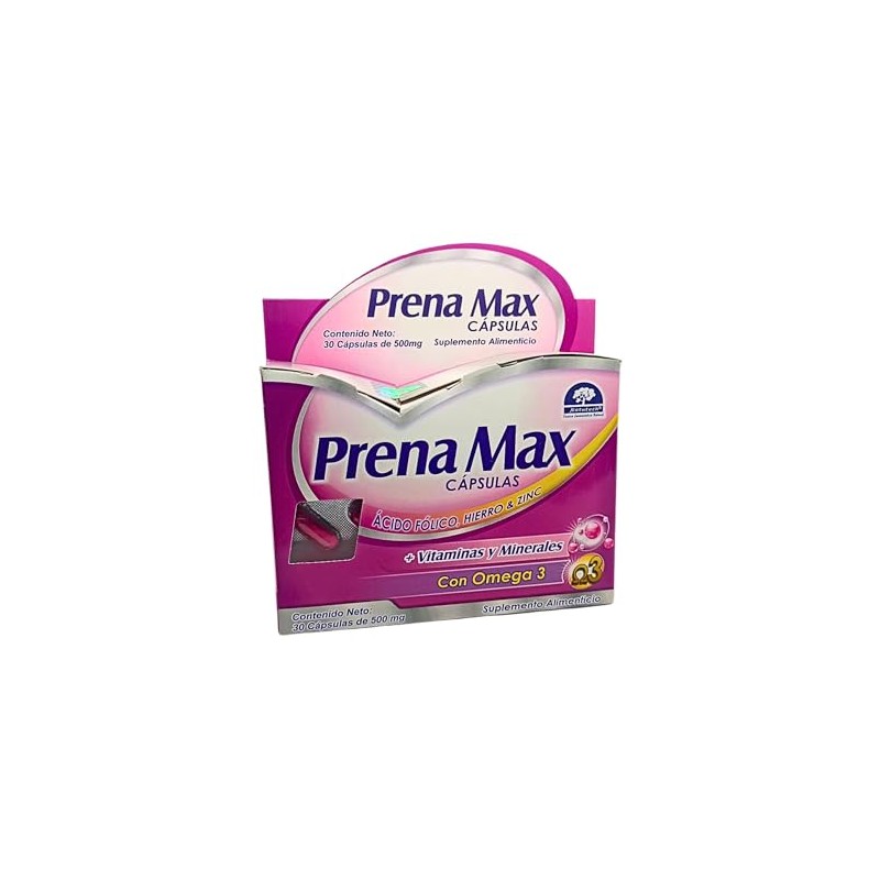 - 3 en mujeres en edad reproductiva que están intentando embarazarse, embarazadas y durante la lactancia. Nuestra fórmula especial proporciona una protección vital contra los defectos del tubo neural en el feto y actúa como profilaxis para prevenir la anemia por deficiencia de hierro y ácido fólico durante el embarazo. Con Prena Max, brindamos un respaldo nutricional completo para cada etapa importante del proceso reproductivo. Beneficios Destacados: Cubre las necesidades nutricionales incrementadas durante la concepción, el embarazo y la lactancia. Protege contra los defectos del tubo neural en el feto. Previene la anemia por deficiencia de hierro y ácido fólico durante el embarazo. Presentación: Cada caja contiene 30 cápsulas para un suministro conveniente y completo. Instrucciones de Uso: Tomar 2 cápsulas al día