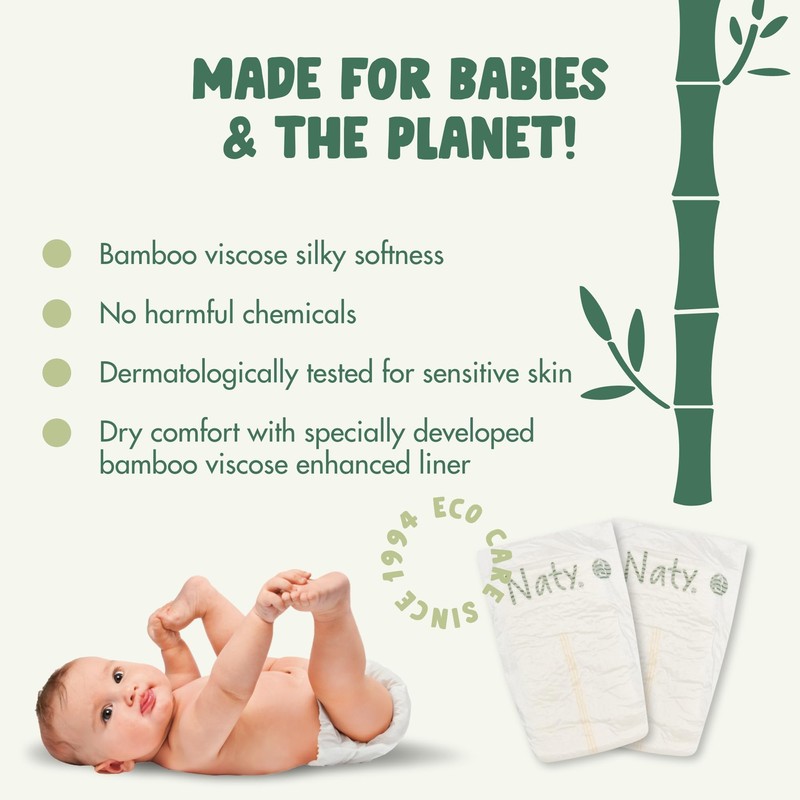 - SILKY SOFT BAMBOO VISCOSE DIAPERS: 100% natural bamboo viscose back sheet and specially developed bamboo viscose enhanced liner, for plant-based super softness and optimal dry comfort. Convenient wetness indicator to signal when it’s time for a change.