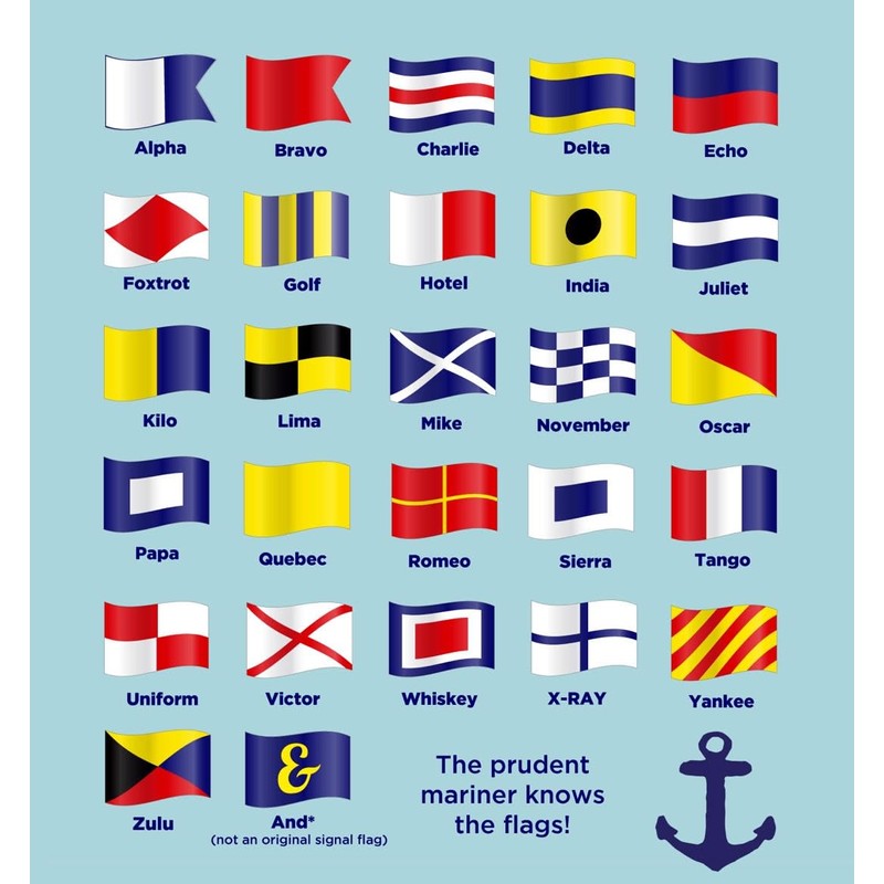 - Add fun color to your boat, front yard, porch or home. There are 26 square nautical flags, each representing a different letter of the alphabet. More accurately, each represents the international code word connected to the letters of the alphabet, such as Alpha, Bravo, Charlie, Delta, and so on. In addition, there are 10 pendants for the numbers zero through nine. For the numbers 10 and larger, a boat would combine flags.