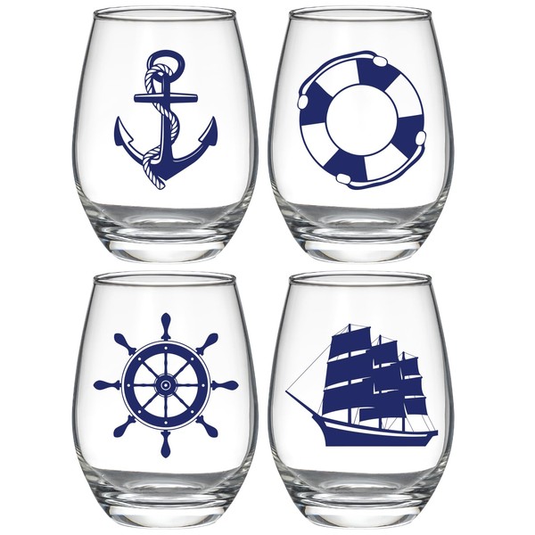 Nautical Stemless Wine Glasses Set of 4, Nautical Gifts for Boaters, Birthday Gift for Sailor, Anchor Compass Life Ring Helm Beach House Glasses 15oz, Coastal Ocean Marine Glasses for Wine or Cocktail