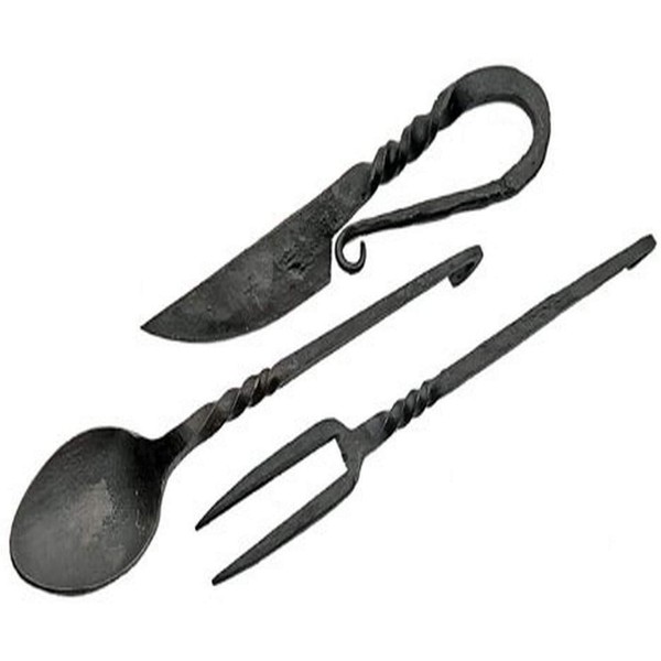 • ✔️★Medieval Style Cutlery set : Hand Forged Flatware made from High Quality Carbon-Steel to remember the Medieval times of Gone yet not forgotten utensil set to enhance the dining experience of collectors and enthusiasts. Each utensil is hand-forged and sculpted from super-heated iron, and a beautiful traditional blacksmith's twist on the handle enriches its splendor. A Remembrance of Medieval age" The five-piece cutlery set consists of the inventively twisted knife, fork, spoon steel handmade.
