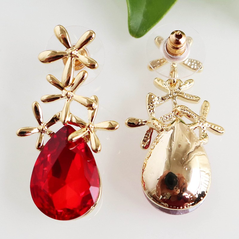Navachi 18k Gold Plated Crystal Leaves Flower Pear-shaped Red Zirconia Drop Dangle Ear Stud Az1504 Earrings