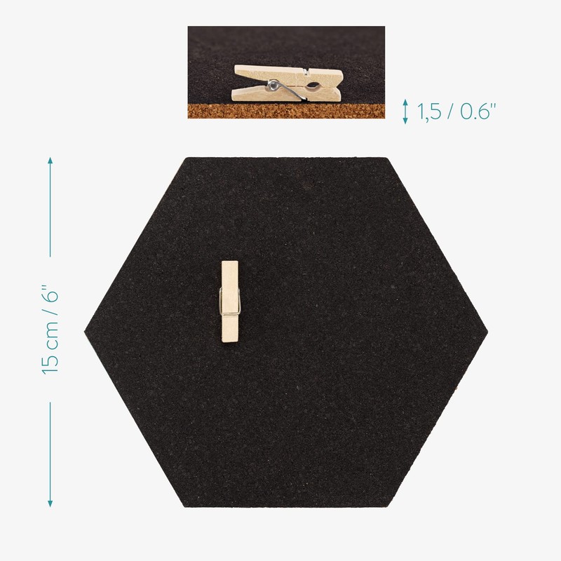 Navaris Hexagon Cork Board Tiles - Set of 10 100% Cork Notice Memo Bulletin Boards with Pack of Wooden Push Pins Clips - 15 x 17.7 cm - Black