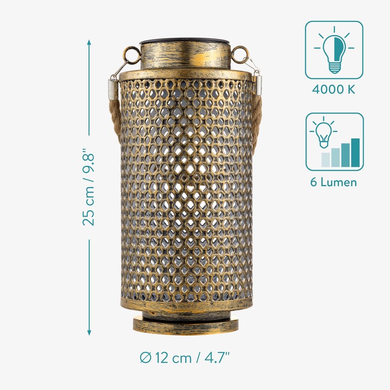 • Details: 1 x LED solar lantern with carry handle / dimensions: diameter 12 x 25 cm / avg. Operating time: 8 hours (when the battery is fully charged). Material: plastic, metal, rope, bamboo, polycrystalline (solar cell). Battery included. Colour: gold