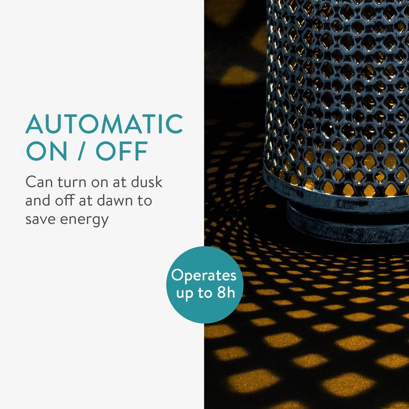 • Weatherproof: thanks to protection class IP44, the garden light is protected from splashes of water and can also be left outside. If it rains, cover the garden lantern or bring it into the house.