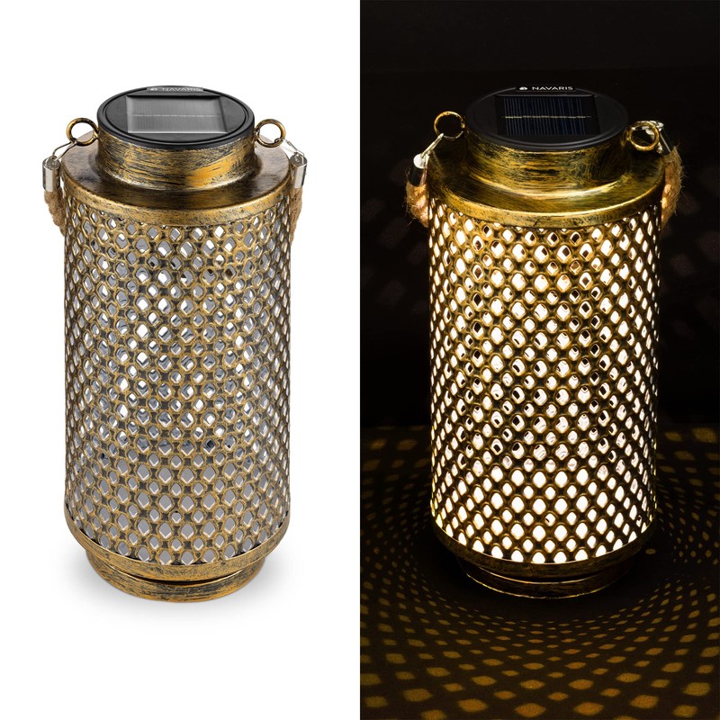 Navaris LED Solar Lantern Cylindrical for Outdoor Use with Carry Handle Cool Shade Effect Oriental Garden Solar Lantern Garden Decoration Lamp Gold