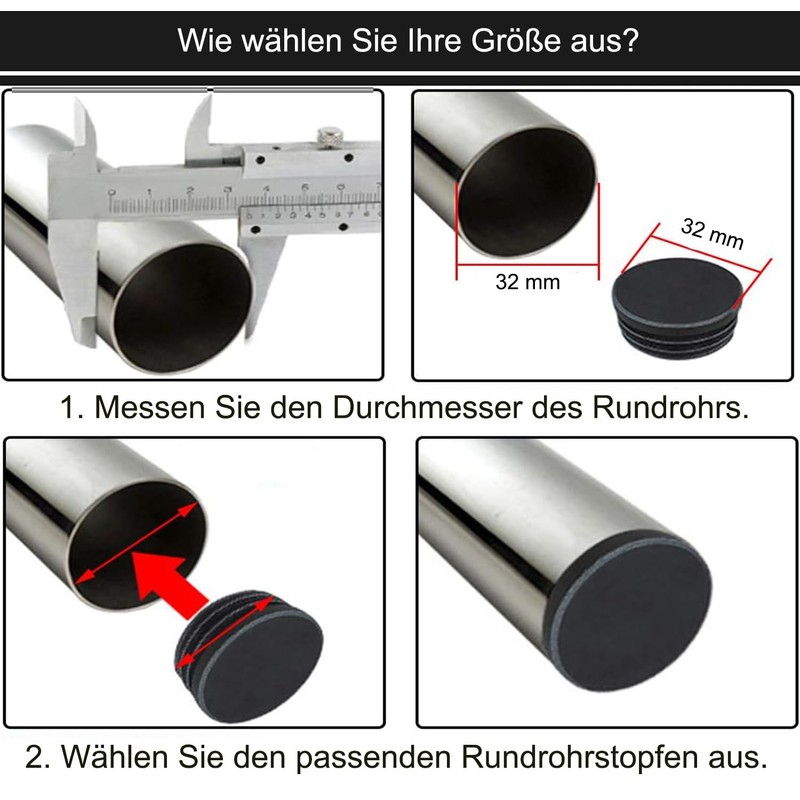 • The lamellar plug is suitable for all metallic round pipes and non-metallic round pipes etc. with a diameter of 32 mm and a pipe wall thickness of 1.5 to 2.0 mm. If you are unsure about the dimensions, you will find instructions for the correct measurement in our product images