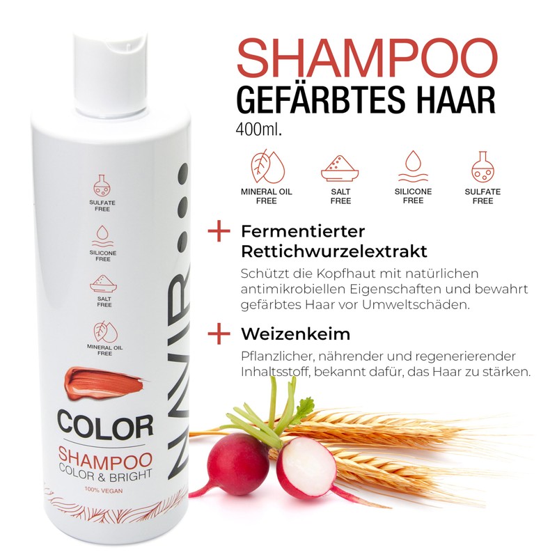 Care for your coloured hair with the complete care set from NAVIR Professional - consisting of the colour shampoo and the colour protection hair mask. This set is designed to maintain colour intensity, deeply hydrate and strengthen hair. Fermented radish root shampoo gently cleanses and protects colour, while the mask with cranberry extract and wheat germ intensively nourishes and repairs - for soft, shiny and healthy hair. The perfect combination for all-round care with visible results from the first use.