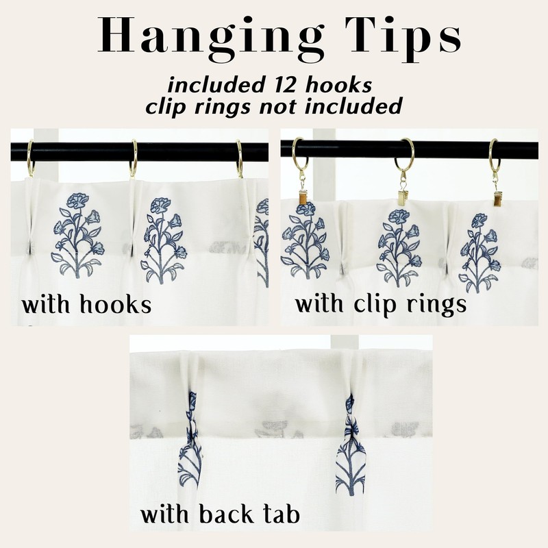 - 3-Way Easy Sliding Hanging Options: Method 1 - With hooks in the pack,simply pin the hooks onto back of curtain as the image shows and pin the other end onto your own curtain rings. Method 2 - If you prefer hiding the tension rod,back tab hanging. Method 3 - With your own ring clips for a more casual style.