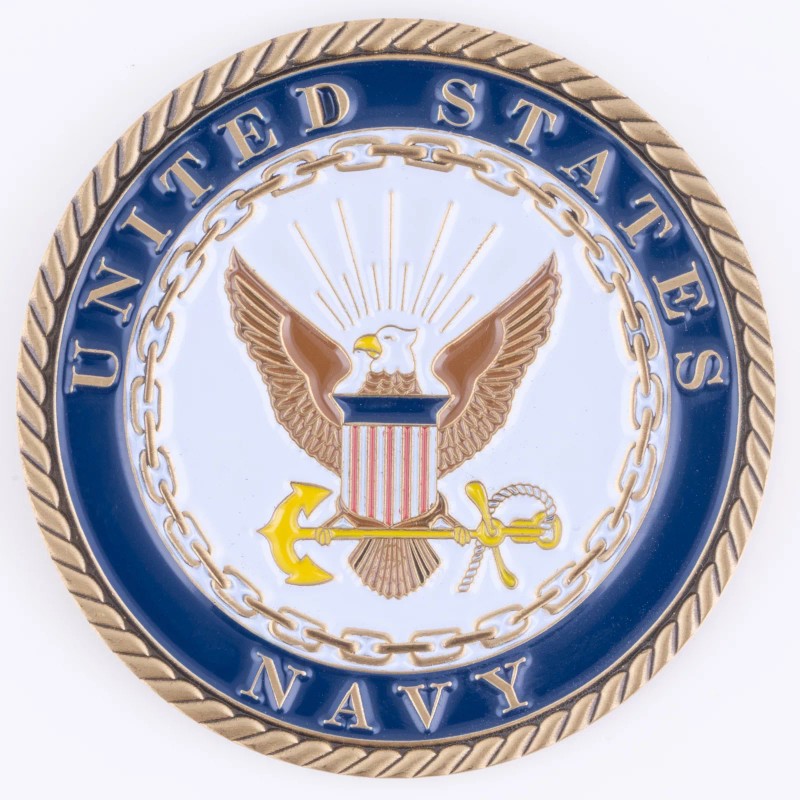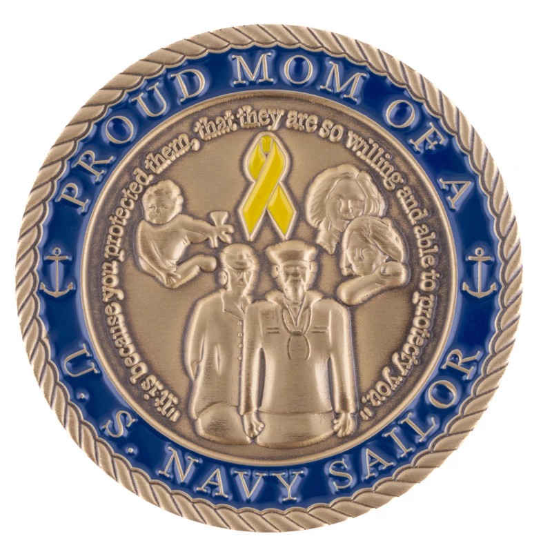 Navy Mother CoinThis 1.75" antique brass challenge coin has a special message about being a proud Navy Mother: "It is because you protected them that they are so willing and able to protect you" and is surrounded by the words "Proud Mom of a U. S. Navy Sailor " in raised brass. This side also features a yellow ribbon and 3D Navy Mom imagery. The reverse side features the Navy Emblem in full color.