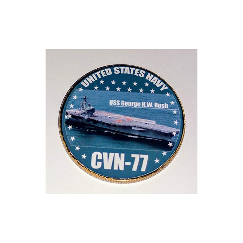 Beautiful Navy USS George H W Bush CVN-77 colorized challenge art coin. This piece is enclosed in a protective acrylic case, weighs approx. 1 ounce and 1.5" in diameter. Item is not solid gold, nor mint issued.