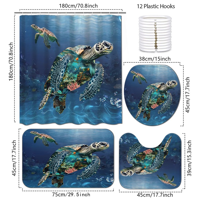 Nazapher Sea Turtle Shower Curtain Set, 4-Piece Ocean-Themed with Marine Life Design, Includes Waterproof Shower Curtain, Non-Slip Rugs, Toilet Lid Cover, and 12 Hooks for Bathroom Decor, 71" x 71"
