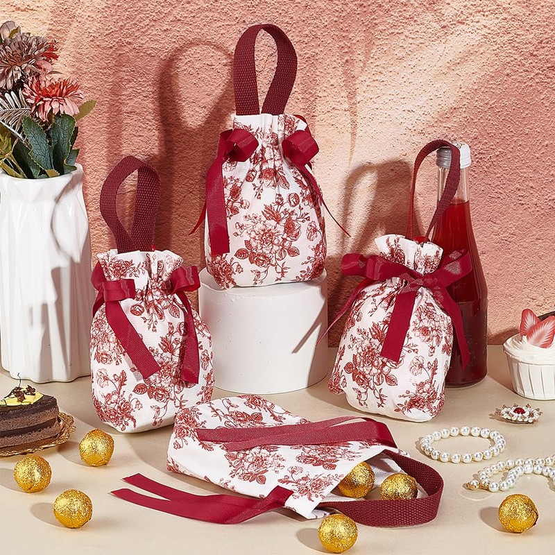 NBEADS 10 Pcs Floral Gift Bags with Handles, Flower Drawstring Bags Tea Party Favor Bags Canvas Small Candy Bag for Wedding Birthday Bridal Shower Tea Party, FireBrick, 17.5x13.5cm