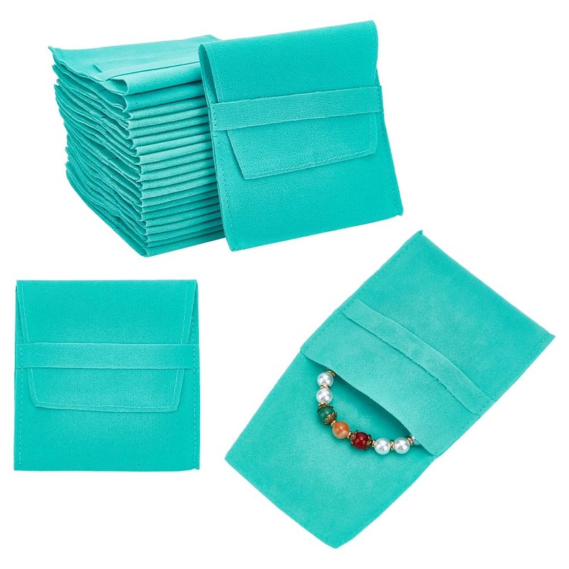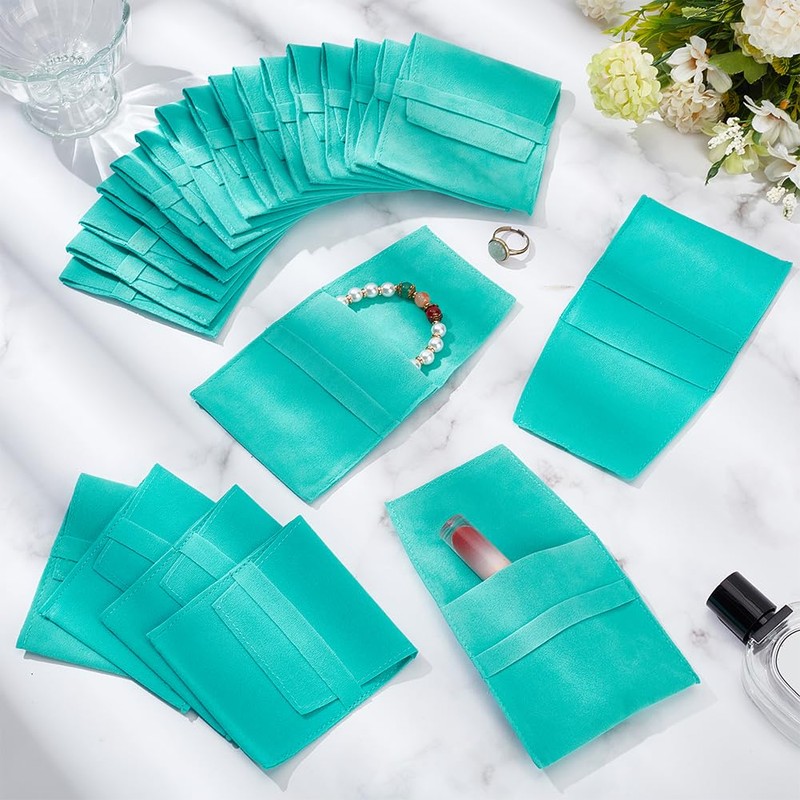 nbeads Pack of 24 Turquoise Microfibre Jewellery Bags, Cosmetic Bag, Velvet Jewellery Flap Bags, Foldable Envelope Bag for Earrings, Bracelets, Necklaces, Packaging, 9.6 x 9 cm