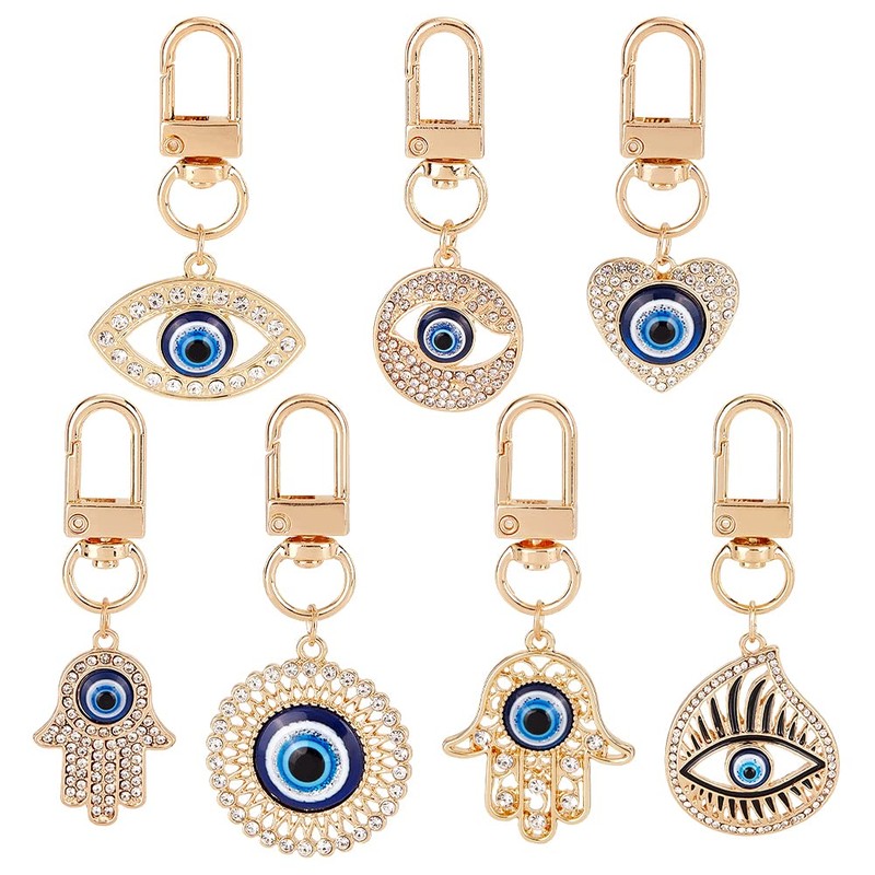 nbeads Pack of 7 Evil Eye Keyrings, Heart Eye Key Fob Purse Key Chain Accessories Hamsa Hand Charm Alloy Rhinestone Pendant Key Ring Stitch Marker for Gifts, gold