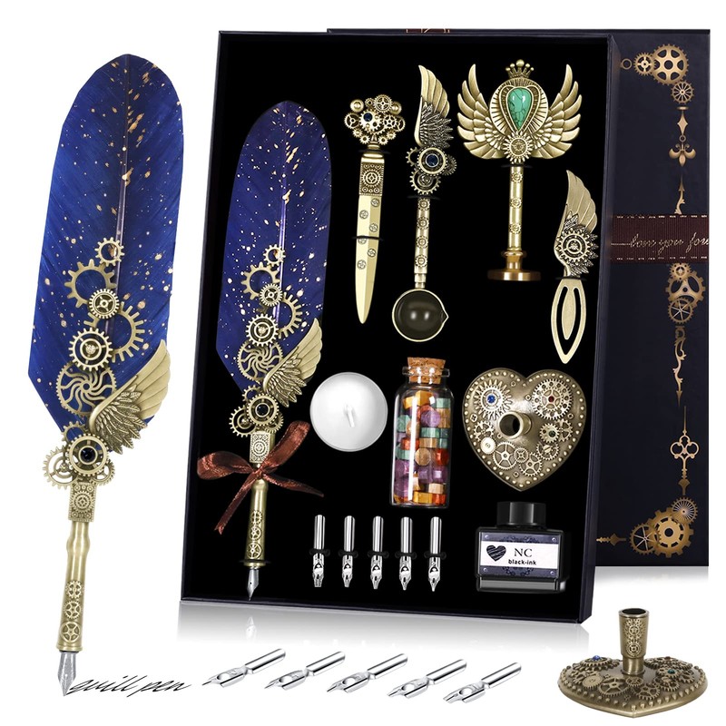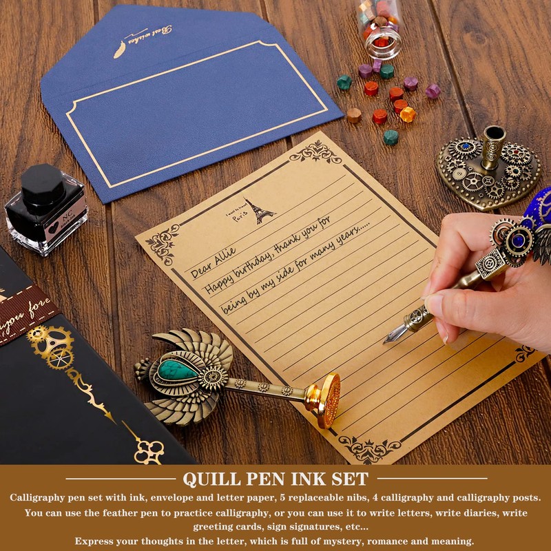 - 💌【FEATHER PEN SET INCLUDES】1*quill pen, 1* ink, 1* love pen holder, 5* replaceable stainless steel nib, 1* envelope, 1* letter paper, 4* calligraphy copybook, 1* bookmark, 1* "gear design" Seal, 1*color wax beads, 1*white wax, 1*melting wax spoon, 1*envelope opening tool, 1*mechanical punk packaging box (in order to express our sincerity, we also used pure hand-pasted bow ribbon).