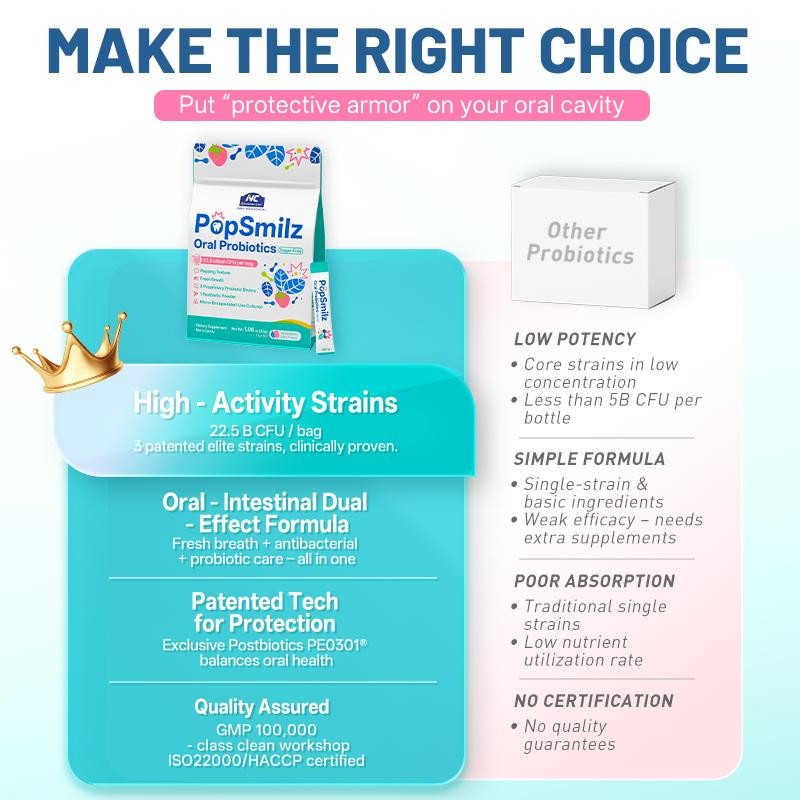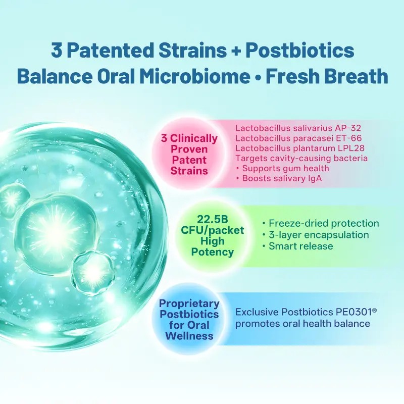 • Oral Health Support: Contains Lactobacillus salivarius AP-32 and other probiotics to promote a healthy oral microbiome.