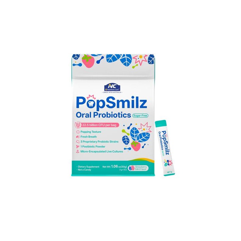 NC PopSmilz Oral Probiotics combine fun and function in sugar-free popping candies designed to support oral health and fresh breath. Each candy contains Lactobacillus salivarius AP-32, along with other beneficial probiotics, to help maintain a healthy oral microbiome. Perfect for health-conscious youth, these candies provide a tasty, sugar-free way to support gut and oral health while reducing sugar intake. The strawberry-flavored popping candy makes oral wellness enjoyable and easy to incorporate into a daily routine.