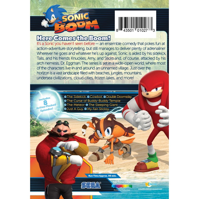 It's a Sonic you haven't seen before an ensemble comedy that pokes fun at action-adventure storytelling, but still manages to deliver plenty of adrenaline! Wherever he goes and whatever he's up against, Sonic is aided by his sidekick, Tails, and his friends Knuckles, Amy, and Sticks and, of course, attacked by his arch nemesis, Dr. Eggman.The series is set in a wide-open world, where most of the characters live in and around an unnamed village. Just over the horizon is a vast landscape filled with beaches, jungles, mountains, undersea civilizations, cloud cities, frozen lakes, and more!Includes 8 Action-Packed Episodes: The Sidekick Cowbot Double Doomsday The Curse of Buddy-Buddy Temple The Meteor The Sleeping Giant Just A Guy My Fair Sticksy