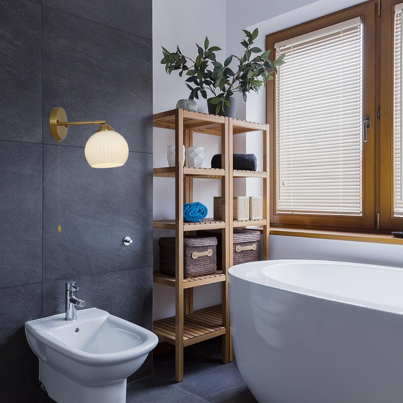 - Gold Wall Sconce, Mid-Century Minimalist Modern Wall Sconce,indoor wall sconce Dresser Bathroom Wall Sconce, brass wall sconce Opalescent Spherical Glass Shade with Hand Pull Switch, Hardwired,wall sconce light with switch (Tri-color light bulb included, you don't need to buy the bulb separately).