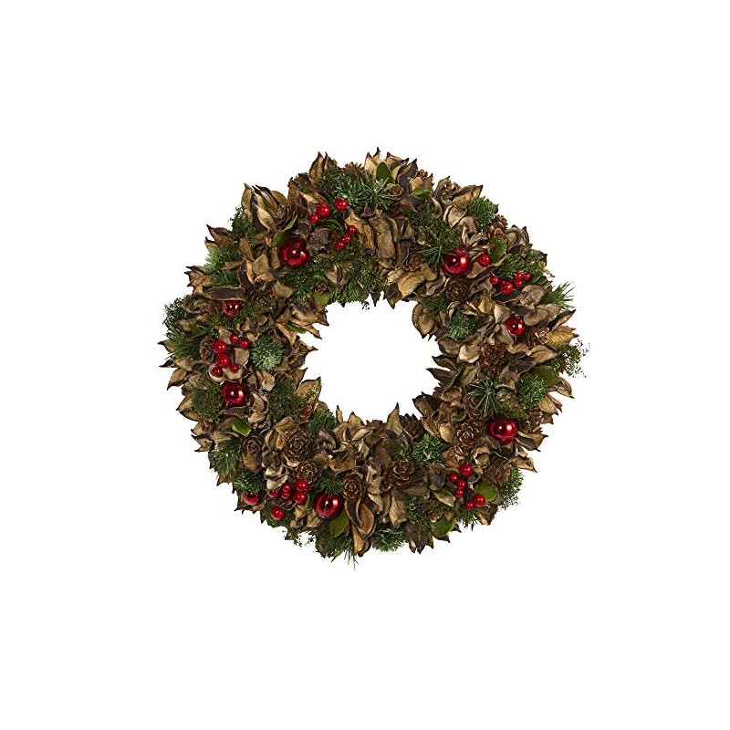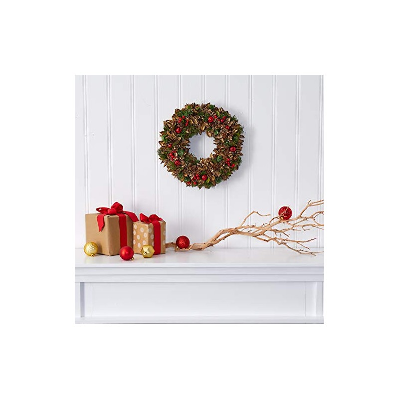 - Balanced mixed of artificial foliage ; Comes with decorative ornaments ; Suitable for either wall and/or door display ; Perfect for seasonal use ; Recommended for indoor use only ; Artificial wreaths are manufactured using synthetic materials and are well designed and constructed to be life-like in appearance ; Item will need to be re-shaped when removed from the box; this wreath can easily bend for reshaping purposes
