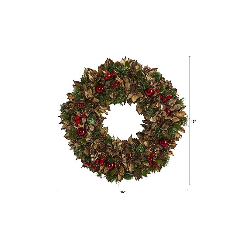 - Update seasonal accents with this artificial wreath designed from mixed greens and leaves, accented throughout with faux pinecones and decorative ornaments to get you into the holiday spirit. Great for bare walls or an empty doorway, this 15” (in circumference) decorative wreath makes for an inviting accent throughout the holiday season.