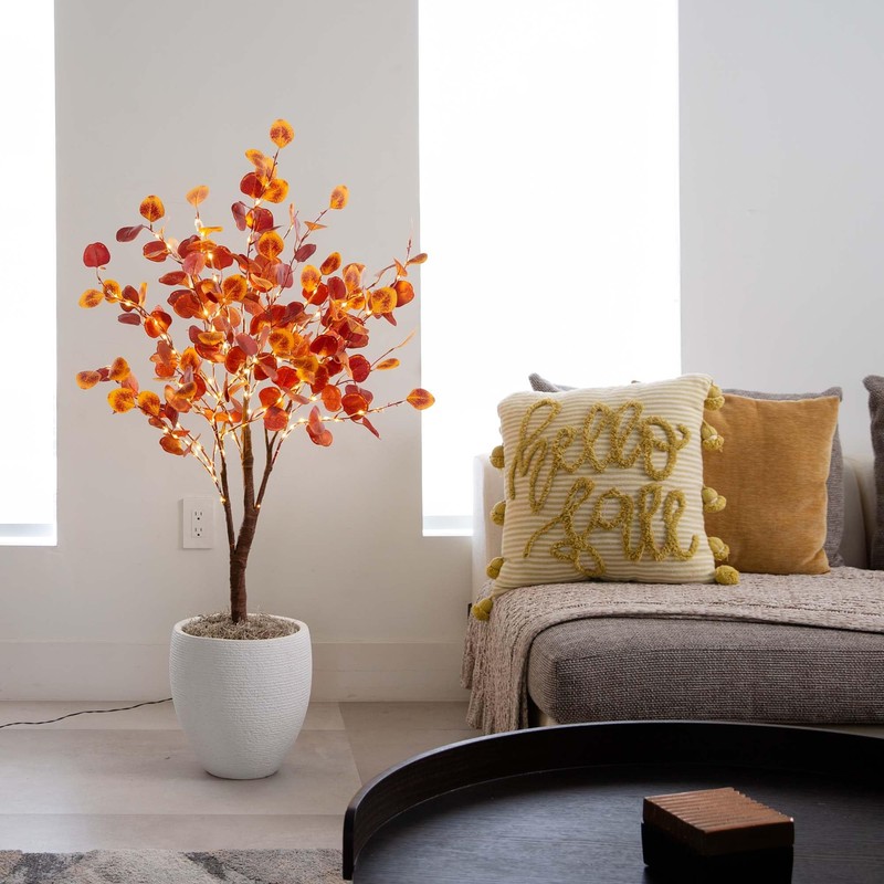 - SEASONAL DÉCOR ACCENT: One of the most beloved fall trees just got a magical update with lights. The autumn eucalyptus tree is back and better than ever. Inspired by the dreamy, picturesque season in Maine, it features smoky shades for a realistic touch. Crafted from high-quality materials, you can bend the branches to fit your space perfectly. Accented with 160 warm white, energy-efficient LED lights, this tree saves you time and money on decorating. You can display it with the lights on or off. Standing 4', including its nursery planter, you can also DIY and add it to your favorite planter. It will add enchantment to any space.