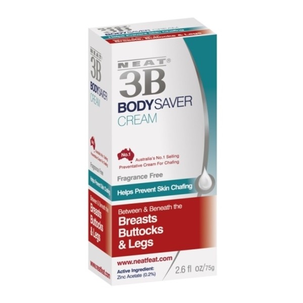 Neat 3B Bodysaver Cream incorporates an effective antiperspirant in an emollient, soothing cream base for application to areas where skin surfaces rub together and become inflamed. The underlying problem in these situations is perspiration and the resultant chafing between skin surfaces: sites at which this occurs are between the buttocks, between the legs and beneath the breasts (hence 3B).