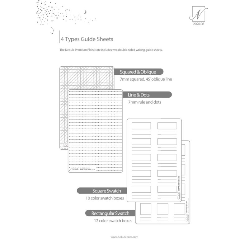 - 8.3"x5.5" Notebook. 90g/m2 ink-proof paper. 192 pages (7mm hieght lines). The Nebula Note Premium Plain includes two double sided writing guide sheets.