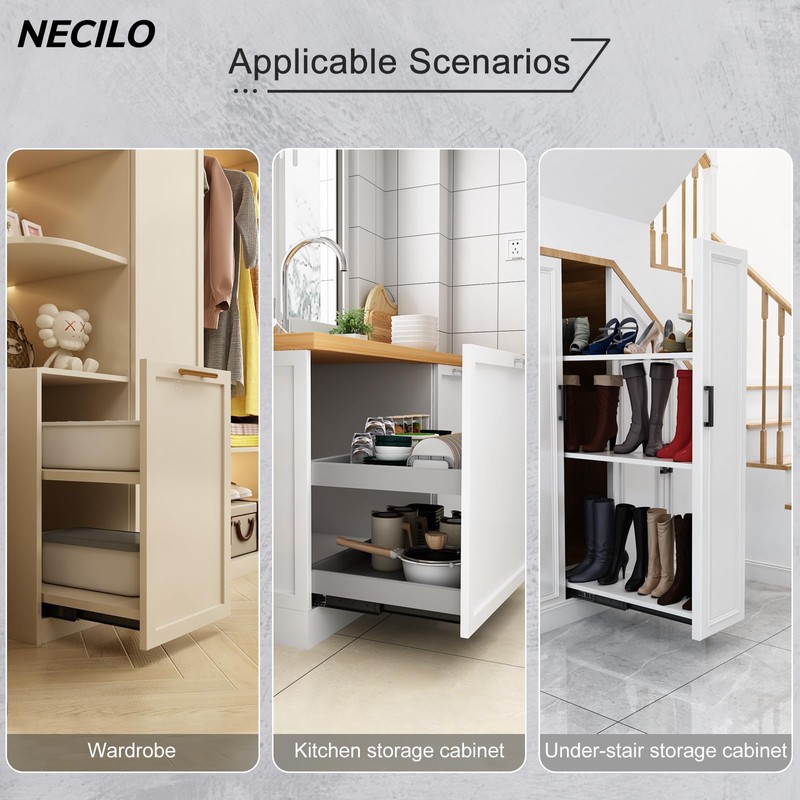 - 【Undermount Concealed Drawer Slides】Bottom-mount design maximizes vertical space efficiency, ideal for narrow or tall storage areas like under-stair cabinets and kitchen corner units. Rails are hidden beneath the cabinet for a streamlined, polished appearance.
