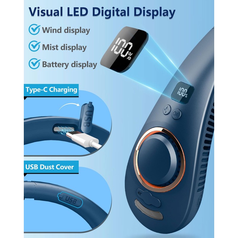 - âăPersonal Neck Fan with LED Displayă Neck fan with mist spray has Visual LED display ensures you can easily know the wind speed, mist mode and battery level. No need to worry about foldaway fan around neckâs battery unexpectedly running out and affecting usage. Hands free portable neck fan rechargeable has built-in 4000mAh rechargeable battery and comes with a TYPE-C charging cable for easy charging. The usb charger port is designed with a dust cover to prevent dust from entering