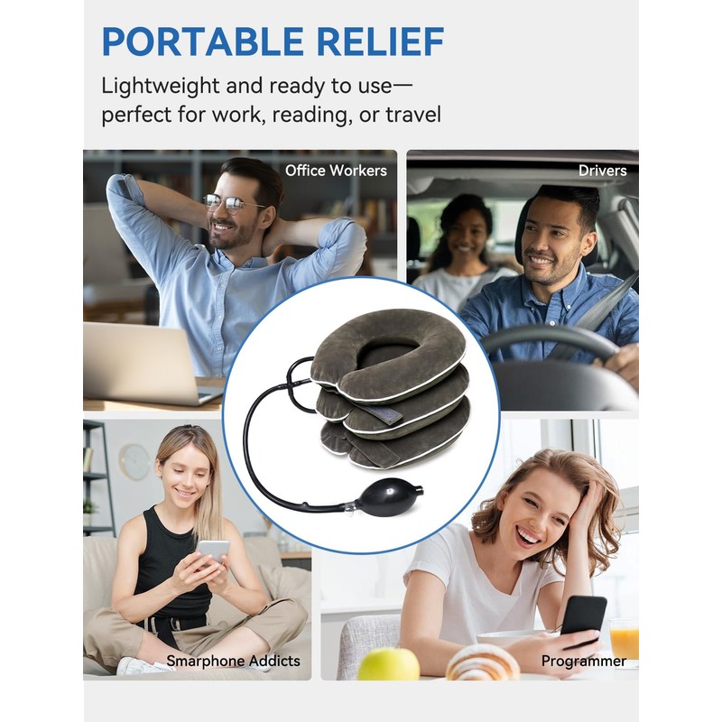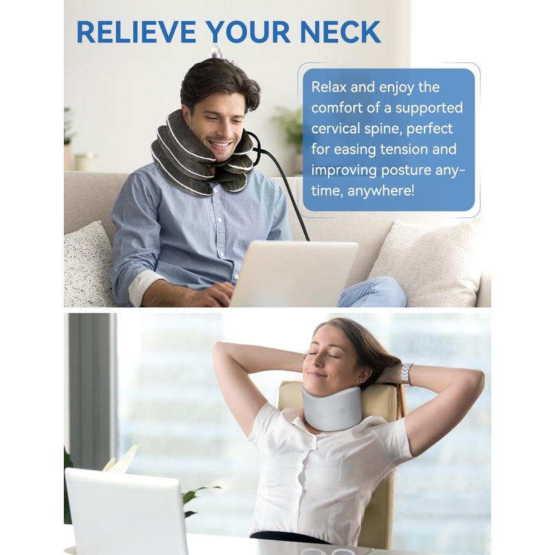 - Adjustable Neck Traction Kit Relieve neck pain and tension with our Neck Traction Kit, featuring a neck traction device and neck brace for fully adjustable support. Ideal for headaches, stiffness, and muscle tension caused by long hours of sitting or work. The three inflatable chambers let you customize the fit to your neck’s curve, providing effective and comfortable traction. It also improves blood flow, easing soreness, stiffness, and promoting deep relaxation. Perfect for work or home, this kit helps correct posture, reduce neck and shoulder strain, and restore comfort and vitality.