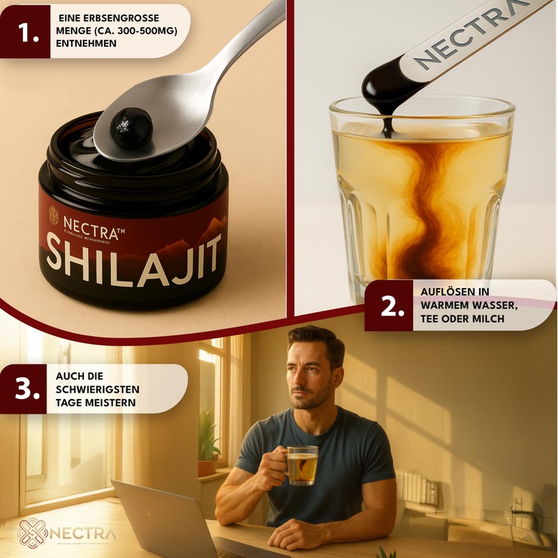 - DOSIEREN. AUFL?SEN. DURCHSTARTEN - 1 erbsengro?e Portion Premium Shilajit (~300C500?mg) in ca. 70C warmem Wasser, Tee oder Milch aufl?sen und trinken. Eine Glas reicht fr 60 Anwendungen. Jetzt bestellenCmorgen durchstarten!