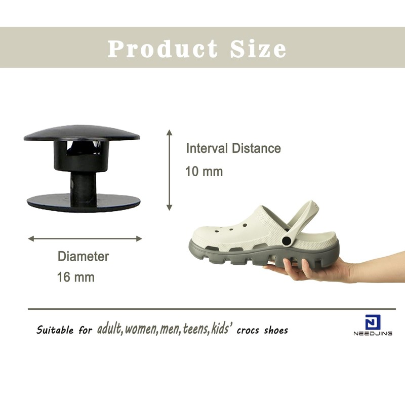 - 2.Its head diameter is 16mm,10mm interval distance,suitable for Crocs style slippers up to 10mm thickness and shoes with the same strap and shoe material.